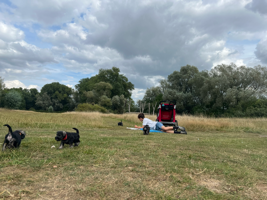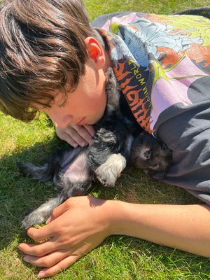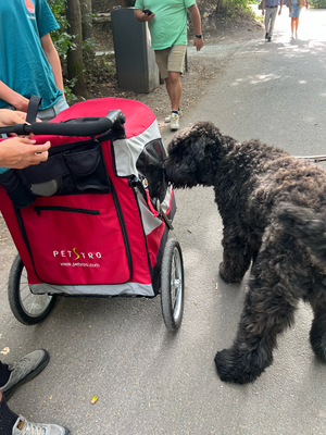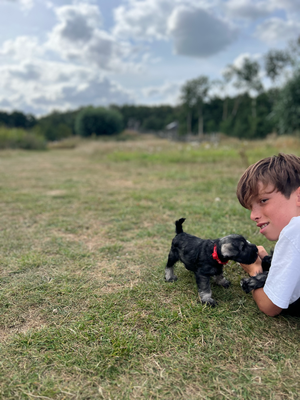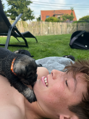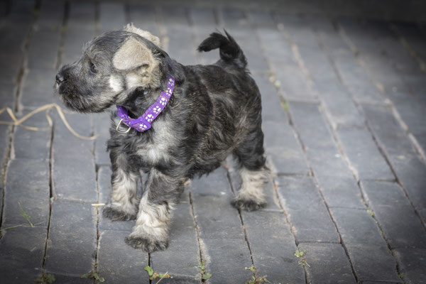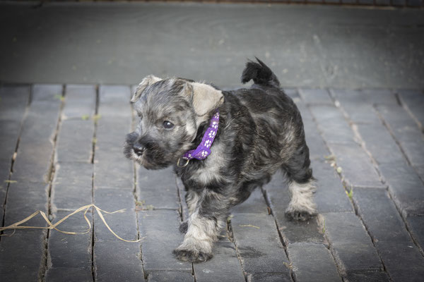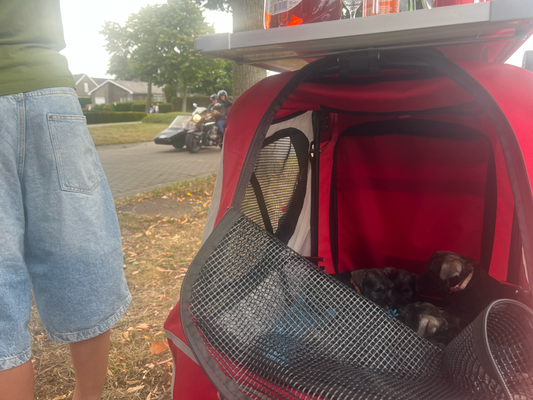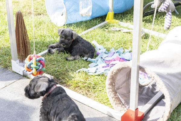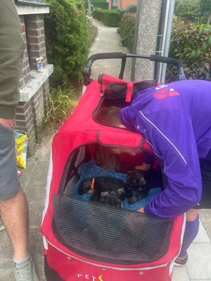 26 augustus: 7 weken oud. Hebben ondertussen al wat extra ervaring opgedaan. Met de buggy op stap, met de auto op bezoeken. Iedereen weet welke pup ze gaan krijgen.