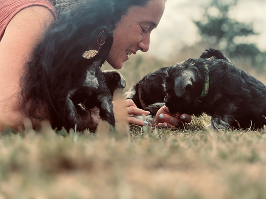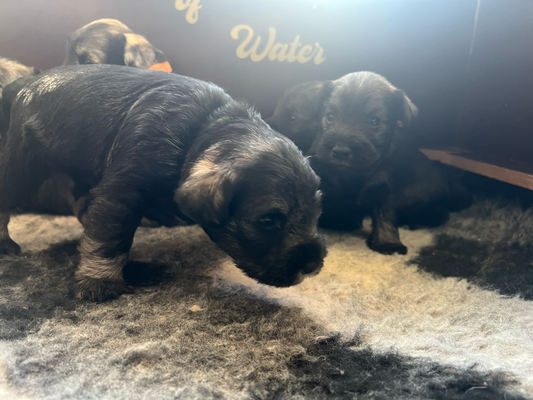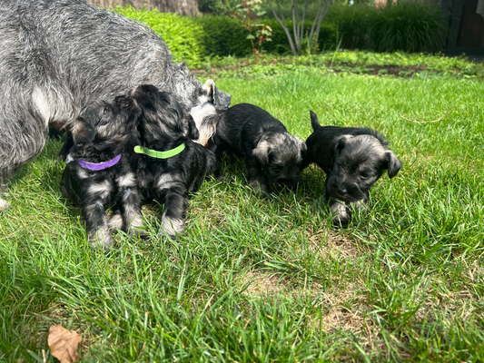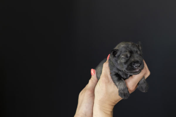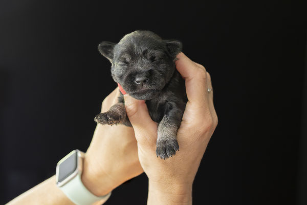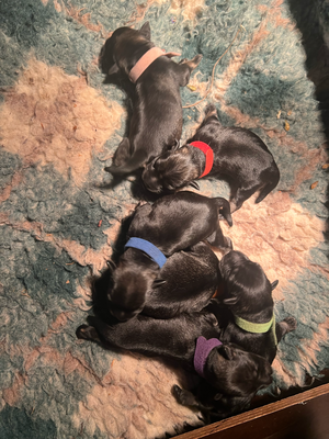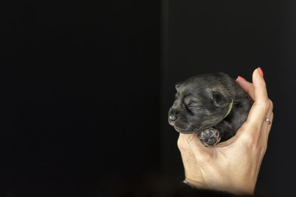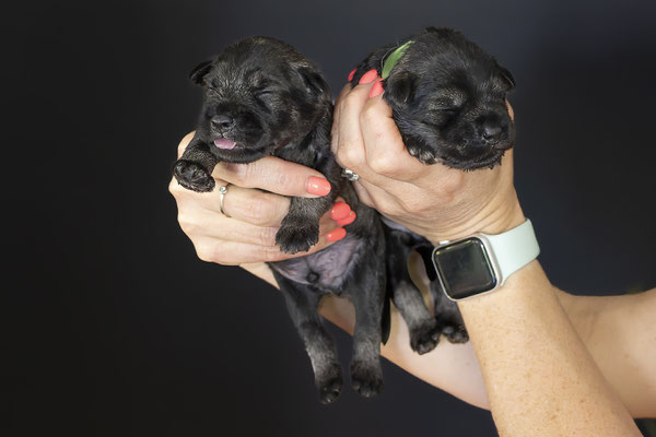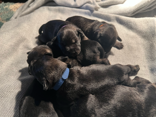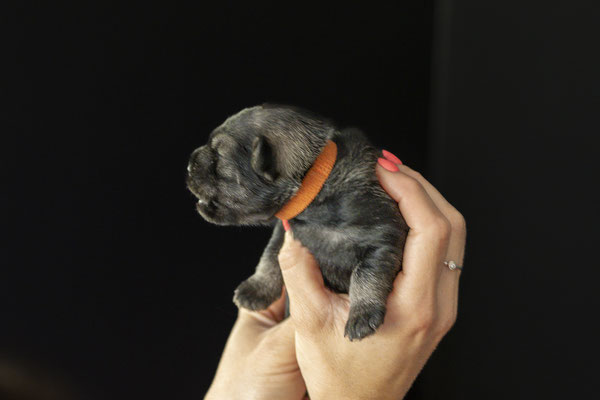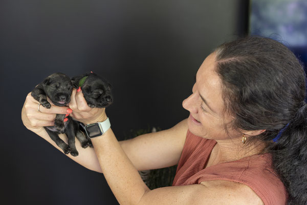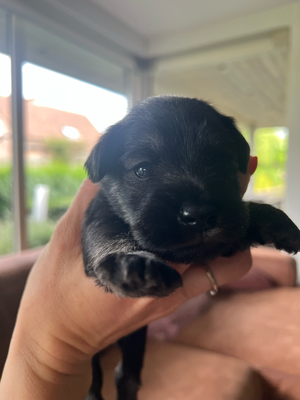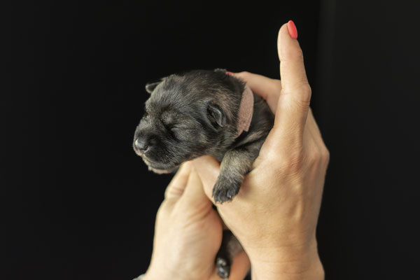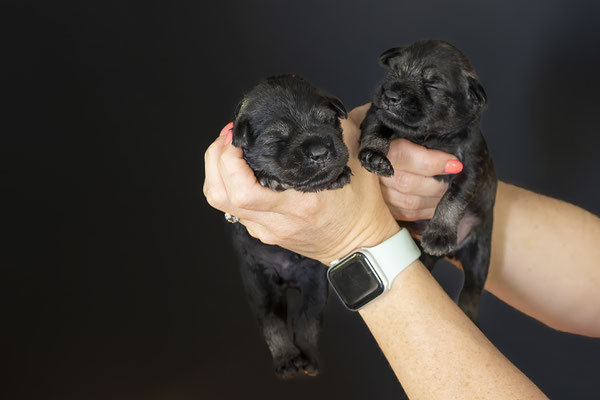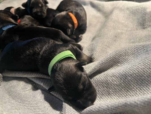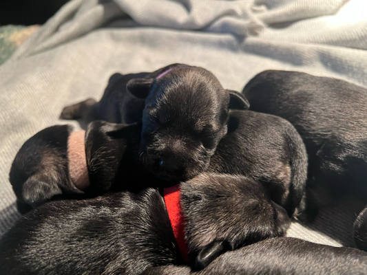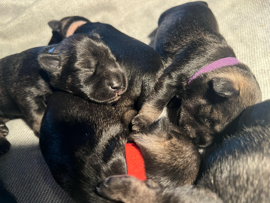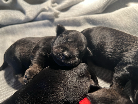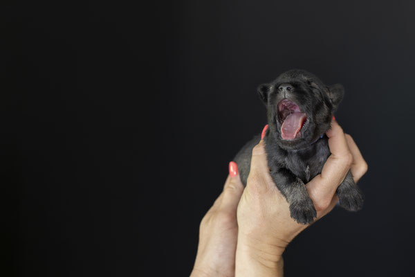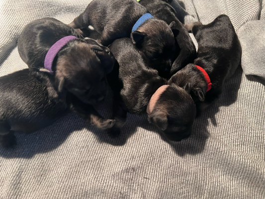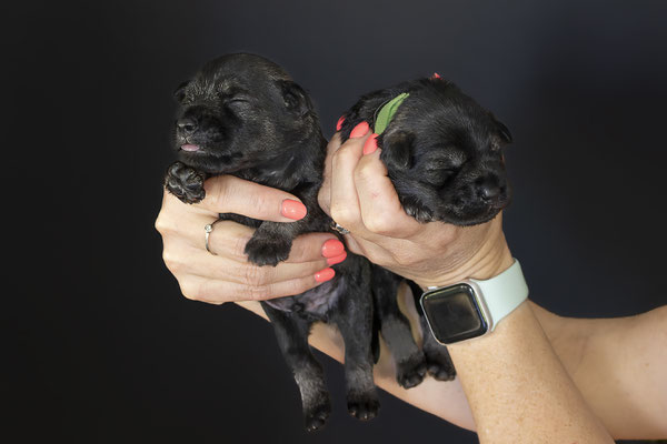 22 juli: De pups zijn nu 2 weken oud en worden voor de eerste maal ontwormd. De gewichten liggen nu tussen de 500 en 600 gr van 5 pups, en groen heeft een groeispurt en weegt 700gr. De oogjes zijn allemaal mooi open. Ze krijgen ook al meer kracht in hun pootjes. Ze kunnen beginnen elkaar te ontdekken.