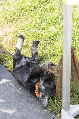 Vega geniet van de airco in het hondensalon, buikje word goed rond.