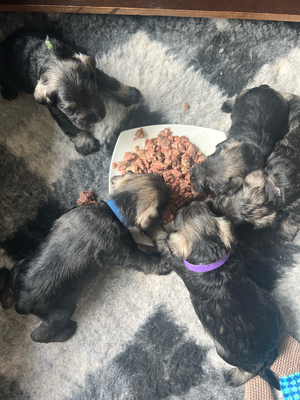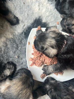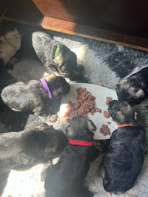 2 augustus: De pups evolueren goed. Maken al veel lawaai, beginnen te spelen. Vandaag hebben we de ruimte groter gemaakt en kregen ze voor de eerste maal vers vlees (rund) voorgeschoteld. Ging al vlot naar binnen.